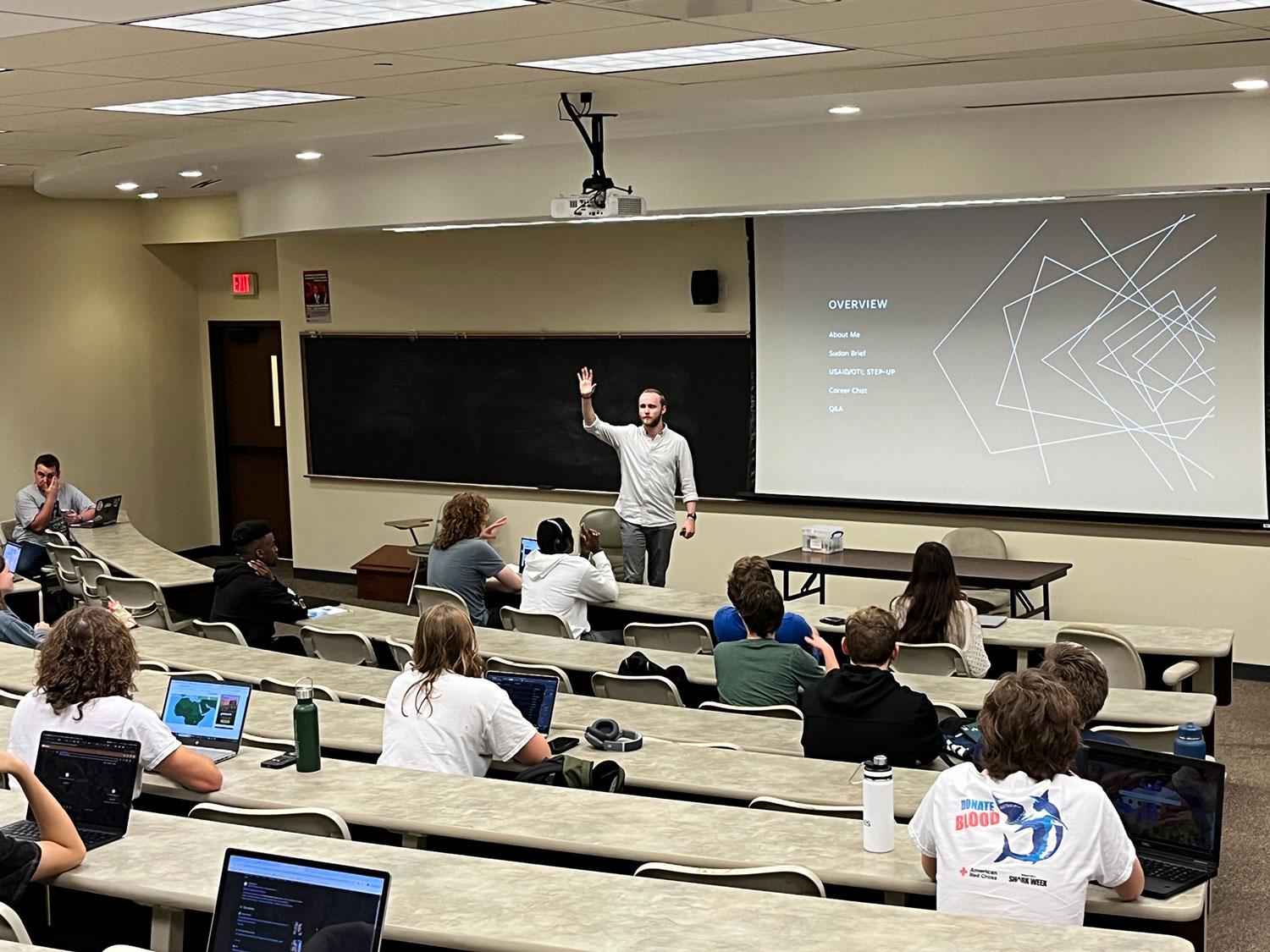 Alumnus Corey Best, who graduated with bachelor's degrees in political science and global studies in 2019, speaks to political science students during a presentation in 2024.